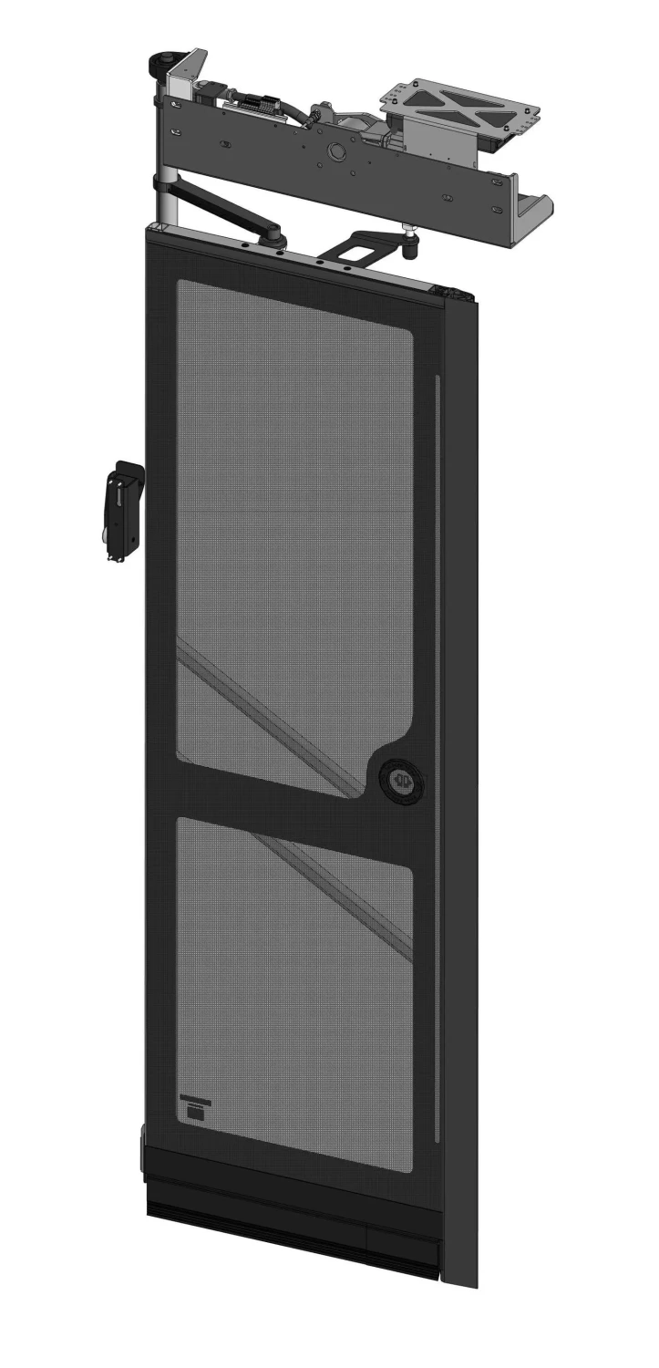 - Приводная часть на базе электромотора или пневмоцилиндров выполнена моноблоком, поэтому конструкция дверной системы максимально универсальна.